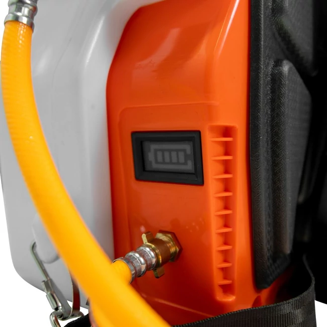 A berendezés LED kijelzővel van felszerelve, amely fontos információkat jelenít meg az akkumulátor töltöttségi szintjéről és a permetezőgép működéséről. Ez az elem biztonságot és kontrollt biztosít a felhasználó számára a használat során.