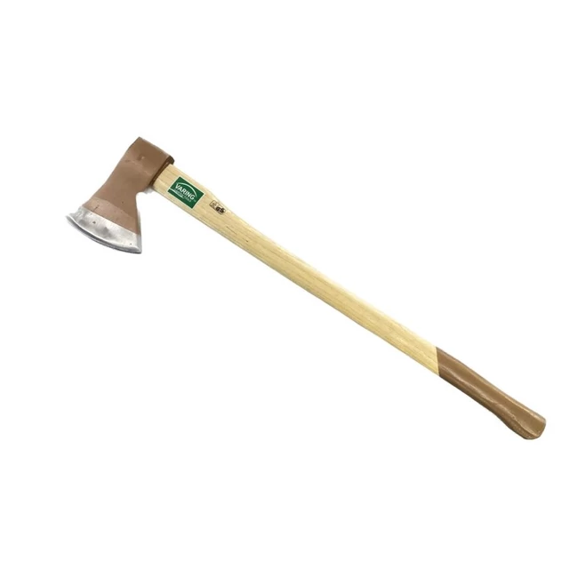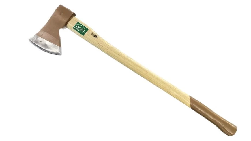 Körcsapolással rögzített, edzett acél fejű balta, formázott, lakkozott fa nyéllel.